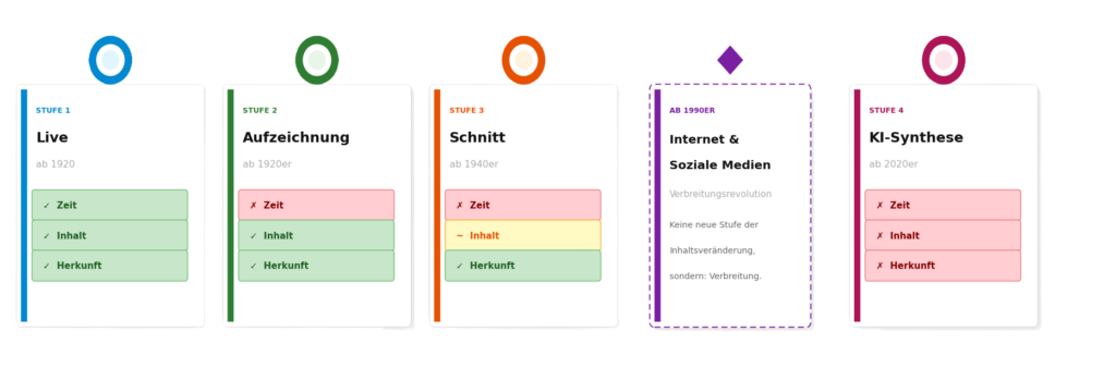 Stufe 3 — Schnitt (Tonband): Das Tonband veränderte alles. Man konnte Passagen entfernen, Inhalte neu aneinanderreihen, Aussagen aus dem Kontext lösen. Hier begann die Möglichkeit, Wirklichkeit zu formen — aus welchem Grund auch immer. Das erzeugte, über die Zeit, ein neues Bewusstsein: Inhalte konnten nicht mehr einfach als wahr vorausgesetzt werden. Die Gesellschaft antwortete darauf — nicht sofort, aber mit der Zeit: mit Redaktionen als Vertrauensinstitutionen, mit Faktenchecks, mit Pressekodizes.